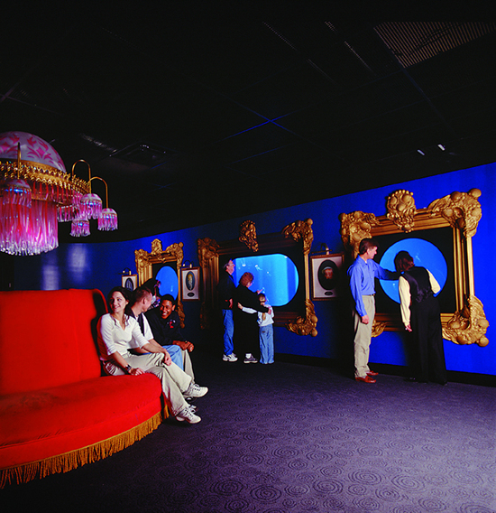 The Jellyfish Exhibit lies at the end of the Kelp Tunnel. This room is nicely stylized and has several viewing tanks as well as a central circular couch.