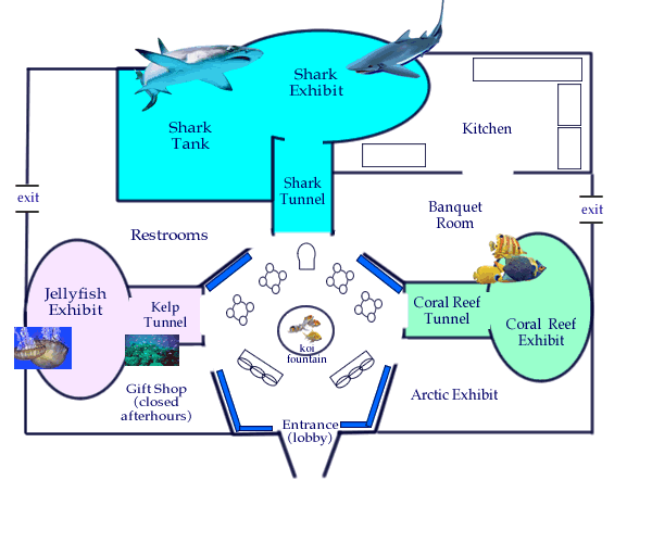 For simplicity, only areas accessible are shown here, keep in mind an aquarium has quite a few mechanical and electrical considerations, tunnels and areas used for maintenance are not shown. Also there is a second level, which allows for access to the the tanks housing the fish and other specimens. Tanks are not accessible from the main area (mainly to keep people from sticking their hands or dropping pennies into the water. Only those given access keys (marine biologists, maintenance crews) can go to the upper areas. |